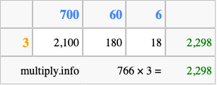 Below is an illustration showing you how to calculate 766 times 3 using the box method, using the instructions above.
