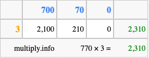 That's all there is to it! As you can see from the box above, the answer to 770 times 3 using the box method is 2,310.