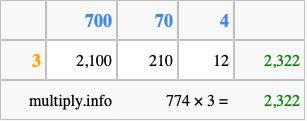 Below is an illustration showing you how to calculate 774 times 3 using the box method, using the instructions above.