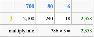 Below is an illustration showing you how to calculate 786 times 3 using the box method, using the instructions above.