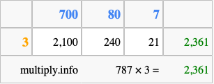 Below is an illustration showing you how to calculate 787 times 3 using the box method, using the instructions above.