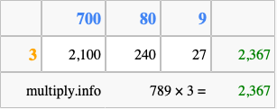 Finally, we add up all the sums we found in step 3 to get our final answer to 789 times 3.
