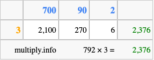 Below is an illustration showing you how to calculate 792 times 3 using the box method, using the instructions above.