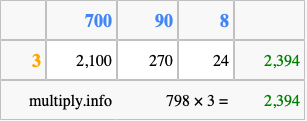 Below is an illustration showing you how to calculate 798 times 3 using the box method, using the instructions above.