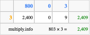 That's all there is to it! As you can see from the box above, the answer to 803 times 3 using the box method is 2,409.