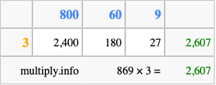 Below is an illustration showing you how to calculate 869 times 3 using the box method, using the instructions above.