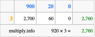 Below is an illustration showing you how to calculate 920 times 3 using the box method, using the instructions above.