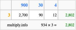 Below is an illustration showing you how to calculate 934 times 3 using the box method, using the instructions above.