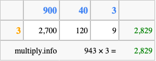 Below is an illustration showing you how to calculate 943 times 3 using the box method, using the instructions above.