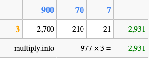 Below is an illustration showing you how to calculate 977 times 3 using the box method, using the instructions above.
