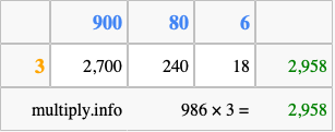 Below is an illustration showing you how to calculate 986 times 3 using the box method, using the instructions above.