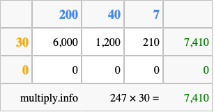 Below is an illustration showing you how to calculate 247 times 30 using the box method, using the instructions above.