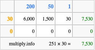 Below is an illustration showing you how to calculate 251 times 30 using the box method, using the instructions above.