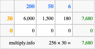 That's all there is to it! As you can see from the box above, the answer to 256 times 30 using the box method is 7,680.
