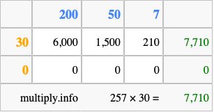 Below is an illustration showing you how to calculate 257 times 30 using the box method, using the instructions above.