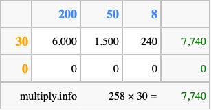 Below is an illustration showing you how to calculate 258 times 30 using the box method, using the instructions above.