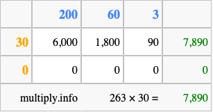 That's all there is to it! As you can see from the box above, the answer to 263 times 30 using the box method is 7,890.