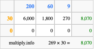 Below is an illustration showing you how to calculate 269 times 30 using the box method, using the instructions above.
