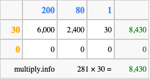 That's all there is to it! As you can see from the box above, the answer to 281 times 30 using the box method is 8,430.