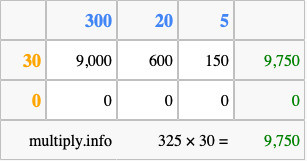 Below is an illustration showing you how to calculate 325 times 30 using the box method, using the instructions above.