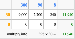 Below is an illustration showing you how to calculate 398 times 30 using the box method, using the instructions above.