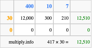 Below is an illustration showing you how to calculate 417 times 30 using the box method, using the instructions above.