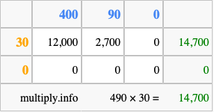 That's all there is to it! As you can see from the box above, the answer to 490 times 30 using the box method is 14,700.