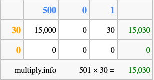 That's all there is to it! As you can see from the box above, the answer to 501 times 30 using the box method is 15,030.