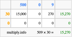 Below is an illustration showing you how to calculate 509 times 30 using the box method, using the instructions above.