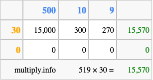 Below is an illustration showing you how to calculate 519 times 30 using the box method, using the instructions above.