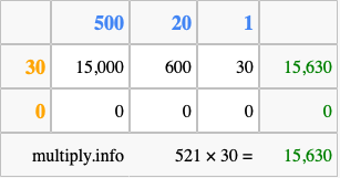 Below is an illustration showing you how to calculate 521 times 30 using the box method, using the instructions above.