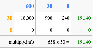 Below is an illustration showing you how to calculate 638 times 30 using the box method, using the instructions above.