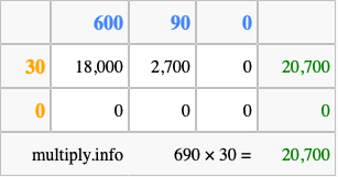 That's all there is to it! As you can see from the box above, the answer to 690 times 30 using the box method is 20,700.