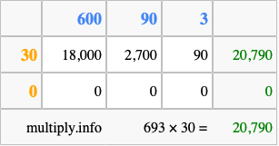 That's all there is to it! As you can see from the box above, the answer to 693 times 30 using the box method is 20,790.