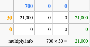 That's all there is to it! As you can see from the box above, the answer to 700 times 30 using the box method is 21,000.
