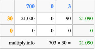 That's all there is to it! As you can see from the box above, the answer to 703 times 30 using the box method is 21,090.