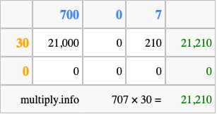 Below is an illustration showing you how to calculate 707 times 30 using the box method, using the instructions above.