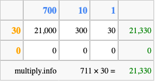 That's all there is to it! As you can see from the box above, the answer to 711 times 30 using the box method is 21,330.