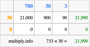 Below is an illustration showing you how to calculate 733 times 30 using the box method, using the instructions above.