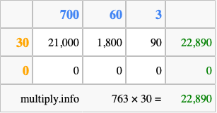 That's all there is to it! As you can see from the box above, the answer to 763 times 30 using the box method is 22,890.