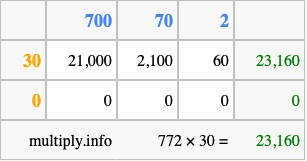Below is an illustration showing you how to calculate 772 times 30 using the box method, using the instructions above.