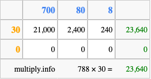 That's all there is to it! As you can see from the box above, the answer to 788 times 30 using the box method is 23,640.