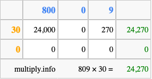 That's all there is to it! As you can see from the box above, the answer to 809 times 30 using the box method is 24,270.
