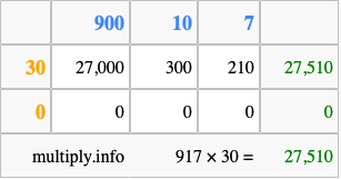 Below is an illustration showing you how to calculate 917 times 30 using the box method, using the instructions above.