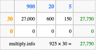 Below is an illustration showing you how to calculate 925 times 30 using the box method, using the instructions above.