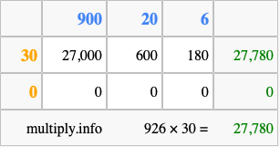 Below is an illustration showing you how to calculate 926 times 30 using the box method, using the instructions above.