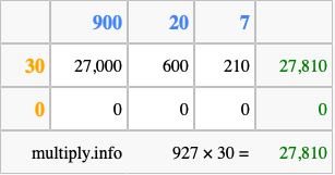 Below is an illustration showing you how to calculate 927 times 30 using the box method, using the instructions above.