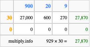 Below is an illustration showing you how to calculate 929 times 30 using the box method, using the instructions above.