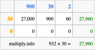 Below is an illustration showing you how to calculate 932 times 30 using the box method, using the instructions above.