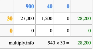 Below is an illustration showing you how to calculate 940 times 30 using the box method, using the instructions above.